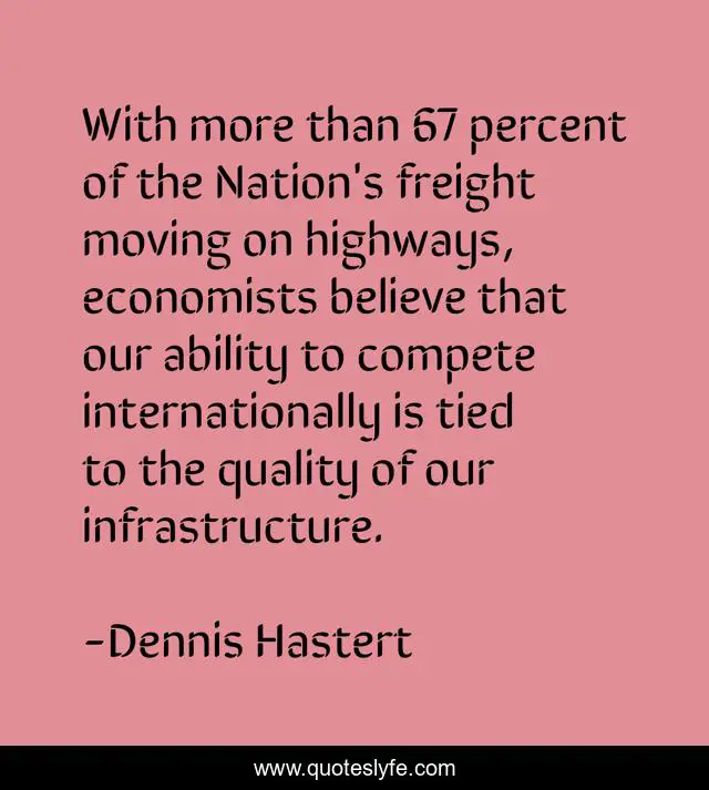 This page presents the quote "With more than 67 percent of the Nation's freight moving on highways, economists believe that our ability to compete internationally is tied to the quality of our infrastructure.". Author of this quote is Dennis Hastert. This quote is about quality, believe, moving,.