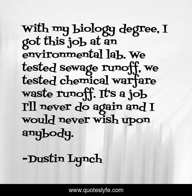 This page presents the quote "With my biology degree, I got this job at an environmental lab. We tested sewage runoff, we tested chemical warfare waste runoff. It's a job I'll never do again and I would never wish upon anybody.". Author of this quote is Dustin Lynch. This quote is about wish, job, biology,.