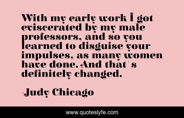 This page presents the quote "With my early work I got eviscerated by my male professors, and so you learned to disguise your impulses, as many women have done. And that's definitely changed.". Author of this quote is Judy Chicago. This quote is about early, work,.
