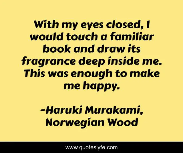 This page presents the quote "With my eyes closed, I would touch a familiar book and draw its fragrance deep inside me. This was enough to make me happy.". Author of this quote is Haruki Murakami, Norwegian Wood. This quote is about books, reading, happiness,.