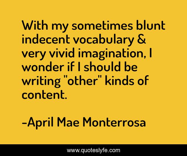 This page presents the quote "With my sometimes blunt indecent vocabulary & very vivid imagination, I wonder if I should be writing "other" kinds of content.". Author of this quote is April Mae Monterrosa. This quote is about vivid, vocabulary, author, writing, content, imagination, erotica, bluntness,.