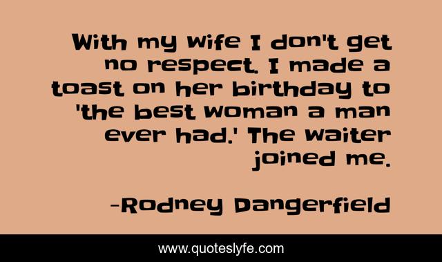 This page presents the quote "With my wife I don't get no respect. I made a toast on her birthday to 'the best woman a man ever had.' The waiter joined me.". Author of this quote is Rodney Dangerfield. This quote is about birthday, best, wife,.