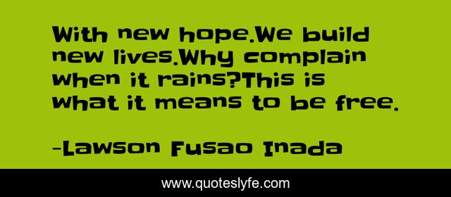 This page presents the quote "With new hope.We build new lives.Why complain when it rains?This is what it means to be free.". Author of this quote is Lawson Fusao Inada. This quote is about freedom, hope, rain,.