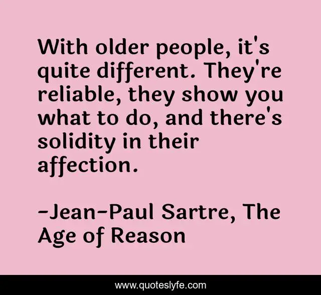This page presents the quote "With older people, it's quite different. They're reliable, they show you what to do, and there's solidity in their affection.". Author of this quote is Jean-Paul Sartre, The Age of Reason. .