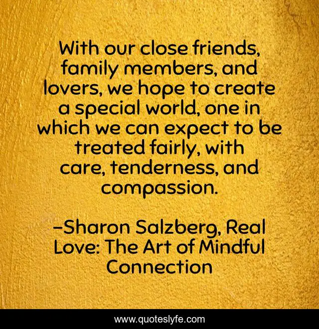 This page presents the quote "With our close friends, family members, and lovers, we hope to create a special world, one in which we can expect to be treated fairly, with care, tenderness, and compassion.". Author of this quote is Sharon Salzberg, Real Love: The Art of Mindful Connection. This quote is about relationships, love, relationship, compassion, tenderness, real-love, affection, care,.