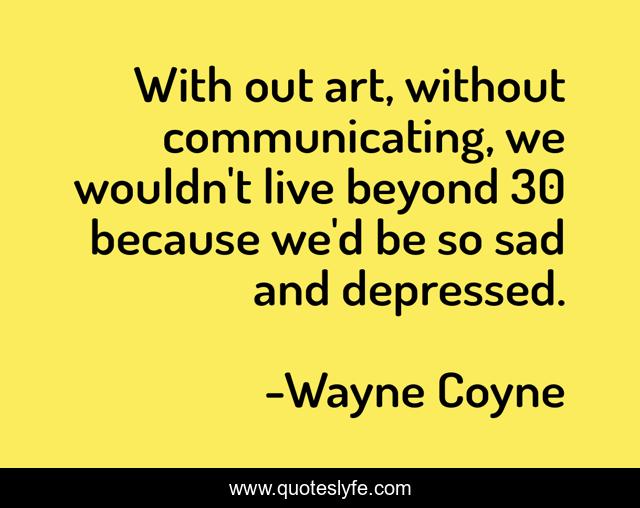 This page presents the quote "With out art, without communicating, we wouldn't live beyond 30 because we'd be so sad and depressed.". Author of this quote is Wayne Coyne. This quote is about depressed, live, art,.