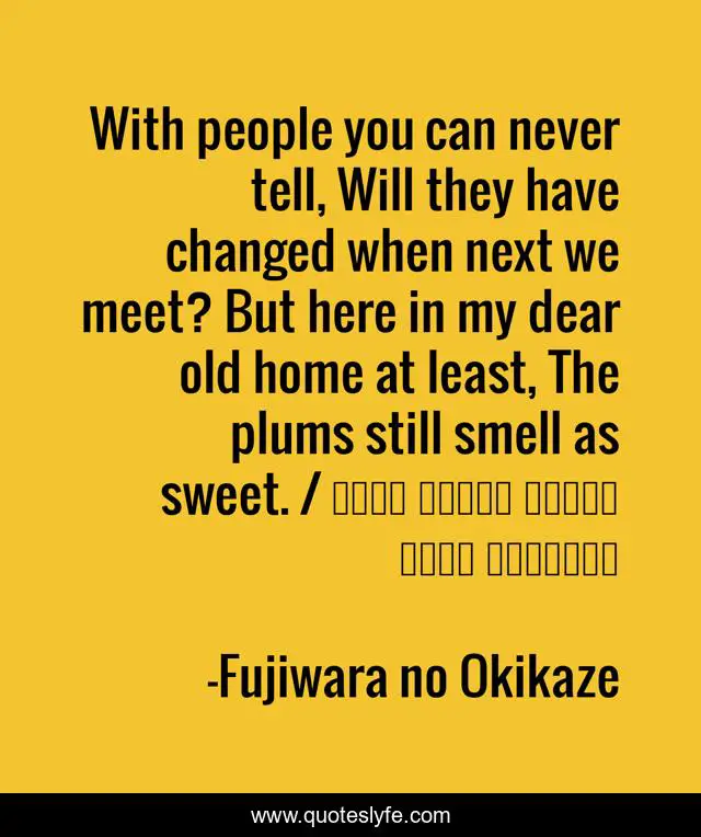 This page presents the quote "With people you can never tell, Will they have changed when next we meet? But here in my dear old home at least, The plums still smell as sweet. / 人はいさ 心も知らず ふるさとは 花ぞ昔の 香ににほひける". Author of this quote is Fujiwara no Okikaze. This quote is about karuta, poem, japanese-poetry,.