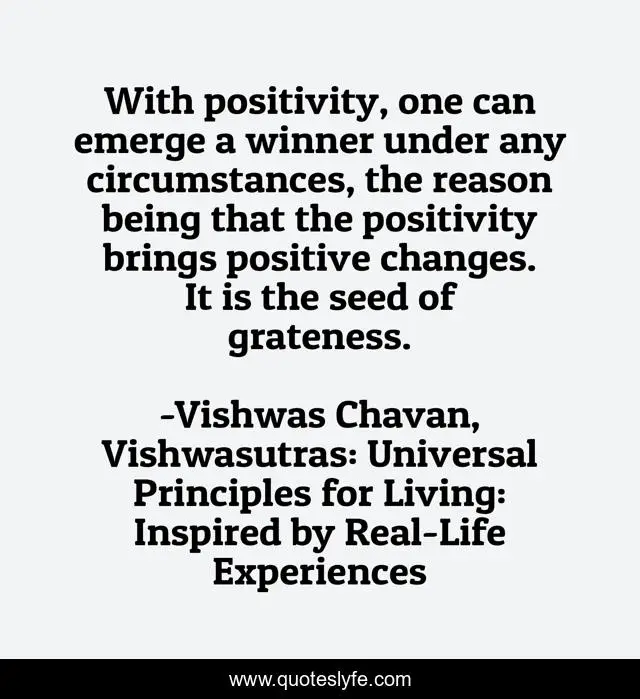 This page presents the quote "With positivity, one can emerge a winner under any circumstances, the reason being that the positivity brings positive changes. It is the seed of grateness.". Author of this quote is Vishwas Chavan, Vishwasutras: Universal Principles for Living: Inspired by Real-Life Experiences. This quote is about enthusiasm, positivity, inspiration, inspirational, self-help,.