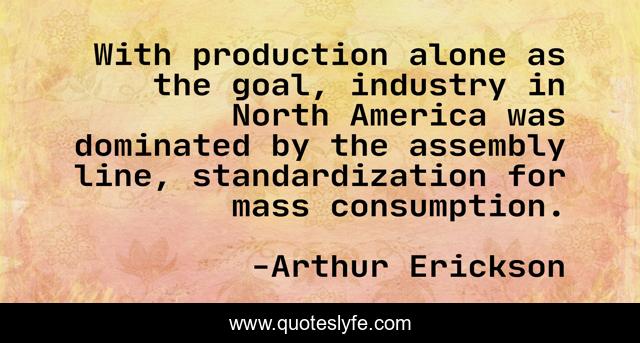This page presents the quote "With production alone as the goal, industry in North America was dominated by the assembly line, standardization for mass consumption.". Author of this quote is Arthur Erickson. This quote is about america, goal, consumption,.