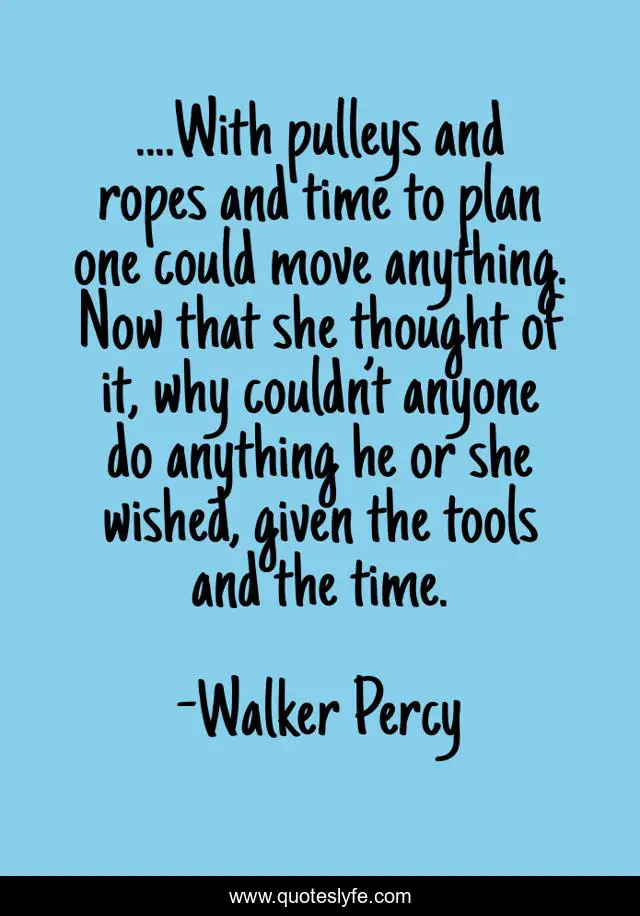 This page presents the quote "....With pulleys and ropes and time to plan one could move anything. Now that she thought of it, why couldn’t anyone do anything he or she wished, given the tools and the time.". Author of this quote is Walker Percy. .