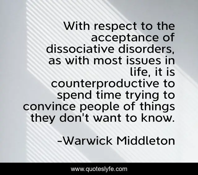 This page presents the quote "With respect to the acceptance of dissociative disorders, as with most issues in life, it is counterproductive to spend time trying to convince people of things they don't want to know.". Author of this quote is Warwick Middleton. This quote is about denial, dissociation, don-t-want-to-know, not-knowing, dissociative-disorders, dissociative-identity-disorder, society-denial, avoidance,.