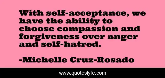 This page presents the quote "With self-acceptance, we have the ability to choose compassion and forgiveness over anger and self-hatred.". Author of this quote is Michelle Cruz-Rosado. This quote is about compassion, self-acceptance, forgiveness, awareness,.