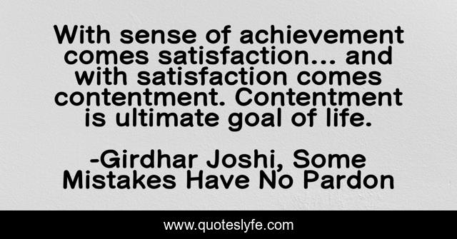 This page presents the quote "With sense of achievement comes satisfaction… and with satisfaction comes contentment. Contentment is ultimate goal of life.". Author of this quote is Girdhar Joshi, Some Mistakes Have No Pardon. This quote is about satisfaction, contentment, achievement,.