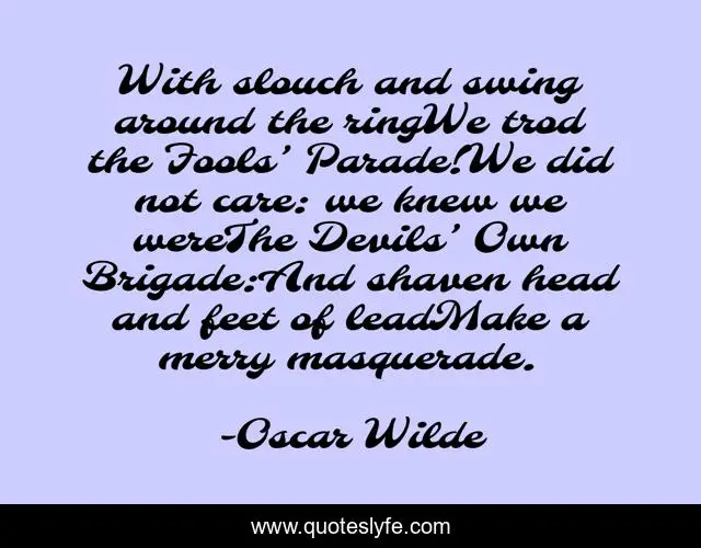 This page presents the quote "With slouch and swing around the ringWe trod the Fools’ Parade!We did not care: we knew we wereThe Devils’ Own Brigade:And shaven head and feet of leadMake a merry masquerade.". Author of this quote is Oscar Wilde. This quote is about books, poetry,.
