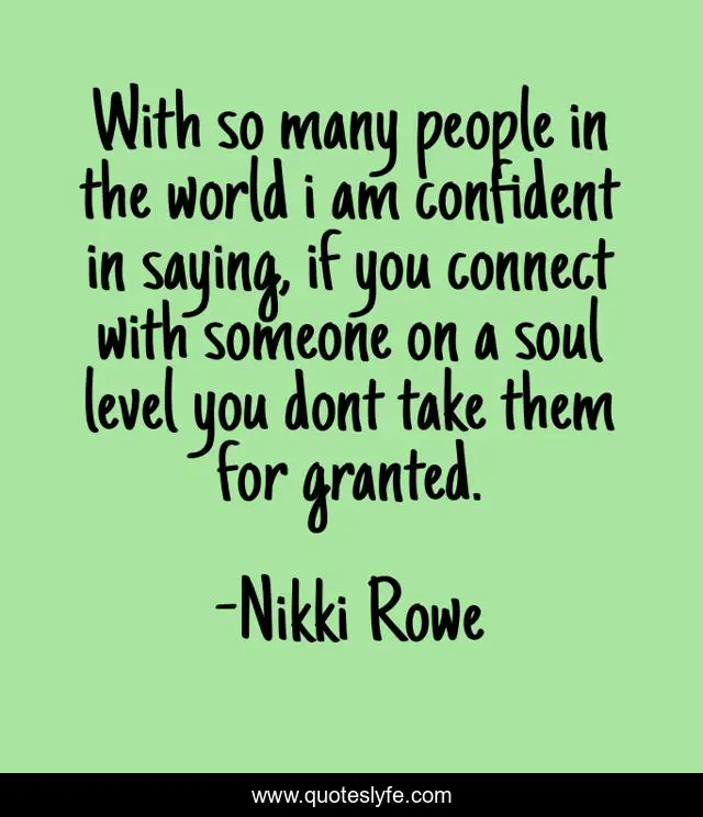This page presents the quote "With so many people in the world i am confident in saying, if you connect with someone on a soul level you dont take them for granted.". Author of this quote is Nikki Rowe. This quote is about love, friendship, soul, companion, twin-flame, soulmate, twin-soul, authentic, soul-connection,.