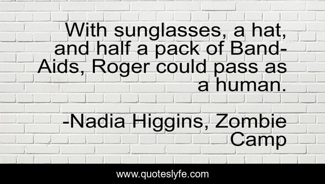 This page presents the quote "With sunglasses, a hat, and half a pack of Band-Aids, Roger could pass as a human.". Author of this quote is Nadia Higgins, Zombie Camp. This quote is about humorous, summer-camp, zombies,.