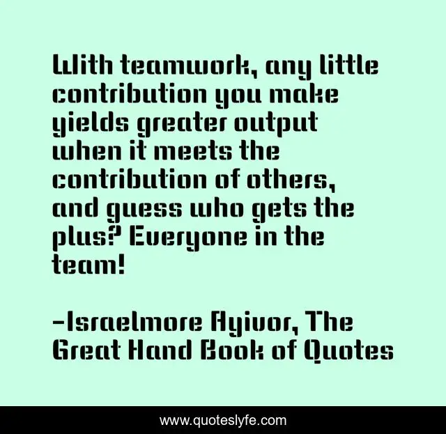 This page presents the quote "With teamwork, any little contribution you make yields greater output when it meets the contribution of others, and guess who gets the plus? Everyone in the team!". Author of this quote is Israelmore Ayivor, The Great Hand Book of Quotes. This quote is about food-for-thought, everyone, greater, co-operation, teamwork, little-contribution, partnership, israelmore-ayivor, guess,.