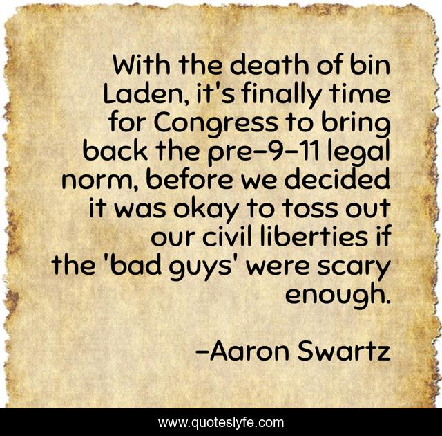 This page presents the quote "With the death of bin Laden, it's finally time for Congress to bring back the pre-9-11 legal norm, before we decided it was okay to toss out our civil liberties if the 'bad guys' were scary enough.". Author of this quote is Aaron Swartz. This quote is about death, okay, time,.