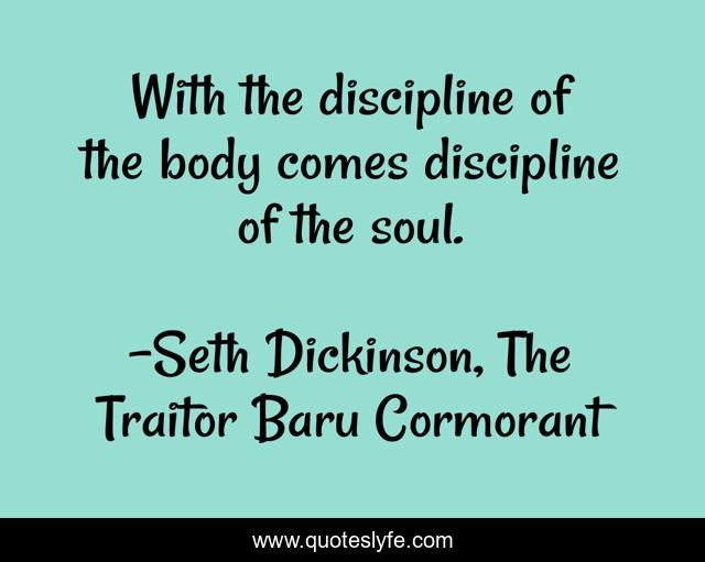 This page presents the quote "With the discipline of the body comes discipline of the soul.". Author of this quote is Seth Dickinson, The Traitor Baru Cormorant. This quote is about body, soul,.