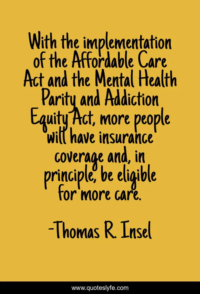 This page presents the quote "With the implementation of the Affordable Care Act and the Mental Health Parity and Addiction Equity Act, more people will have insurance coverage and, in principle, be eligible for more care.". Author of this quote is Thomas R. Insel. This quote is about mental health, people,.