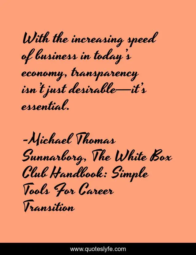 This page presents the quote "With the increasing speed of business in today’s economy, transparency isn’t just desirable—it’s essential.". Author of this quote is Michael Thomas Sunnarborg, The White Box Club Handbook: Simple Tools For Career Transition. This quote is about trust, business-relationship, transparency,.