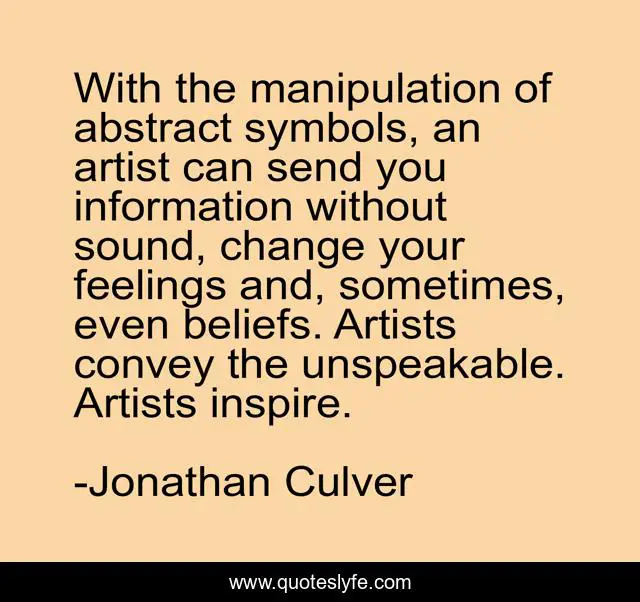 This page presents the quote "With the manipulation of abstract symbols, an artist can send you information without sound, change your feelings and, sometimes, even beliefs. Artists convey the unspeakable. Artists inspire.". Author of this quote is Jonathan Culver. This quote is about symbols, shamanism, artists, art, inspiration,.