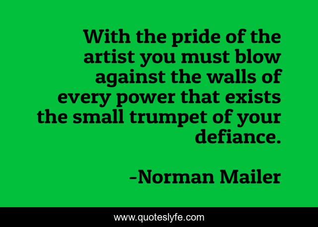This page presents the quote "With the pride of the artist you must blow against the walls of every power that exists the small trumpet of your defiance.". Author of this quote is Norman Mailer. This quote is about art, artist,.