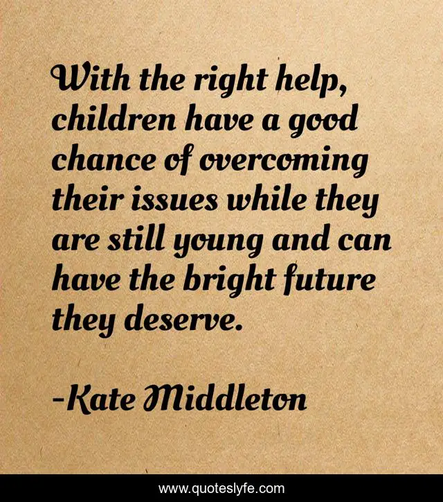 This page presents the quote "With the right help, children have a good chance of overcoming their issues while they are still young and can have the bright future they deserve.". Author of this quote is Kate Middleton. This quote is about future, good, children,.