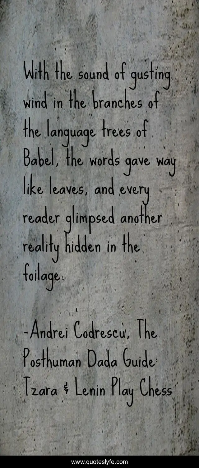 This page presents the quote "With the sound of gusting wind in the branches of the language trees of Babel, the words gave way like leaves, and every reader glimpsed another reality hidden in the foilage.". Author of this quote is Andrei Codrescu, The Posthuman Dada Guide: Tzara & Lenin Play Chess. This quote is about reading, dada, language,.