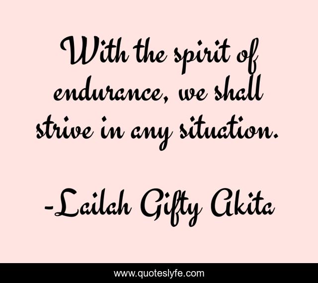 This page presents the quote "With the spirit of endurance, we shall strive in any situation.". Author of this quote is Lailah Gifty Akita. This quote is about faith, motivation, situations, endurance, problems, encouragement, difficulties, hope,.