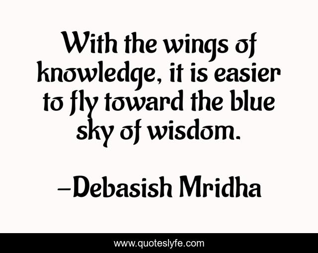 This page presents the quote "With the wings of knowledge, it is easier to fly toward the blue sky of wisdom.". Author of this quote is Debasish Mridha. This quote is about wings-of-knowledge, knowledge, philosophy, debasish-mridha, wisdom, quotes, inspirational, enthusiasm, debasish-mridha-m-d,.