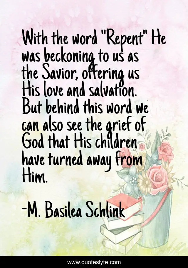 This page presents the quote "With the word "Repent" He was beckoning to us as the Savior, offering us His love and salvation. But behind this word we can also see the grief of God that His children have turned away from Him.". Author of this quote is M. Basilea Schlink. This quote is about peace, christian, god, repentance, jesus, joy, joy-filled,.