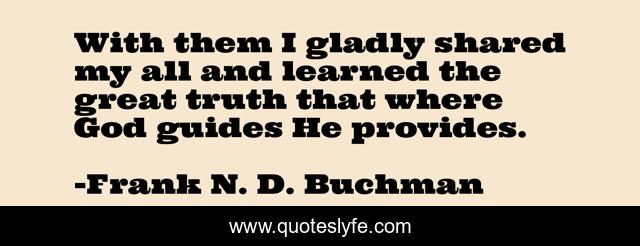 This page presents the quote "With them I gladly shared my all and learned the great truth that where God guides He provides.". Author of this quote is Frank N. D. Buchman. .