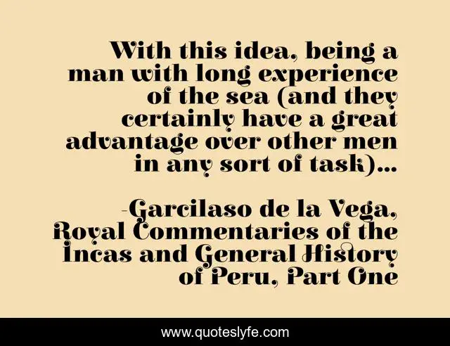 This page presents the quote "With this idea, being a man with long experience of the sea (and they certainly have a great advantage over other men in any sort of task)...". Author of this quote is Garcilaso de la Vega, Royal Commentaries of the Incas and General History of Peru, Part One. This quote is about oceans, maritime, sailing, sea,.