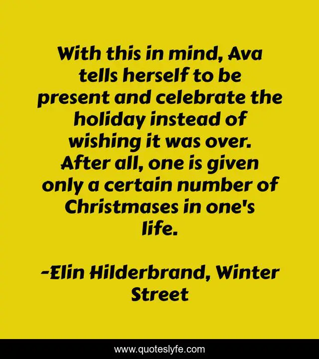 This page presents the quote "With this in mind, Ava tells herself to be present and celebrate the holiday instead of wishing it was over. After all, one is given only a certain number of Christmases in one's life.". Author of this quote is Elin Hilderbrand, Winter Street. .