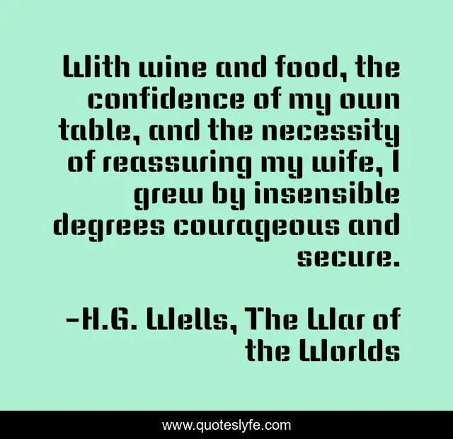 This page presents the quote "With wine and food, the confidence of my own table, and the necessity of reassuring my wife, I grew by insensible degrees courageous and secure.". Author of this quote is H.G. Wells, The War of the Worlds. .