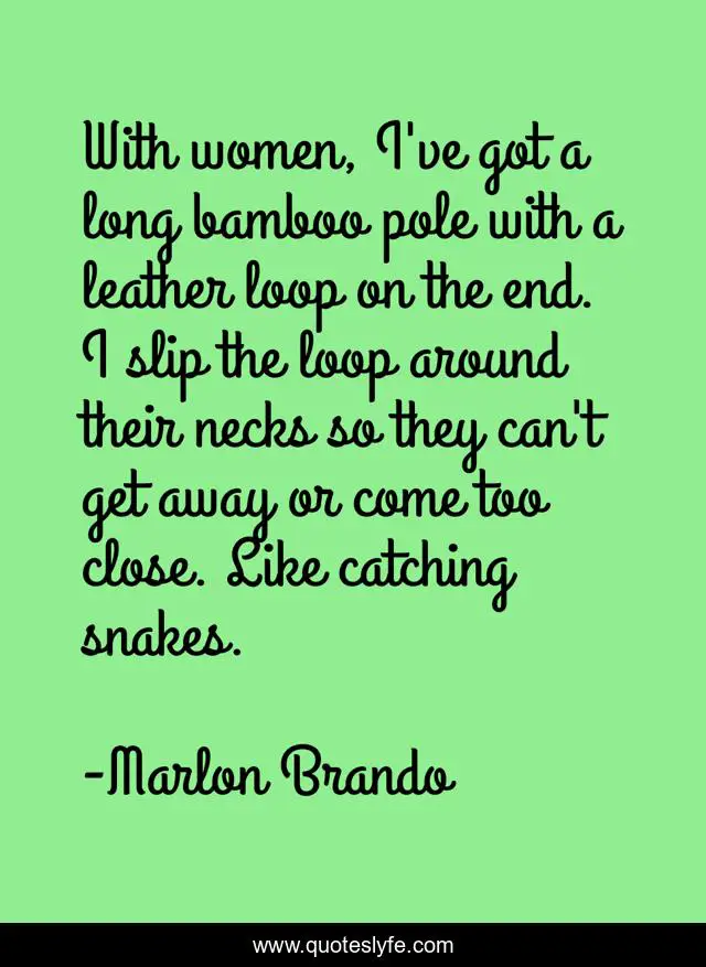 This page presents the quote "With women, I've got a long bamboo pole with a leather loop on the end. I slip the loop around their necks so they can't get away or come too close. Like catching snakes.". Author of this quote is Marlon Brando. This quote is about leather, end, long,.