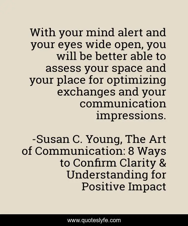 "Susan C. Young, The Art of Communication: 8 Ways to Confirm Clarity & Understanding for Positive Impact Quotes." Quoteslyfe.com, 2025. Mon. 08 Dec. 2025. <https://www.quoteslyfe.com/quote/With-your-mind-alert-and-your-eyes-233448>.