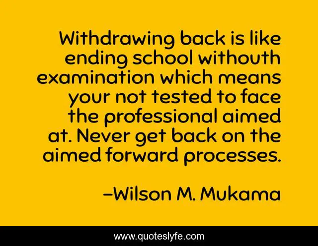 This page presents the quote "Withdrawing back is like ending school withouth examination which means your not tested to face the professional aimed at. Never get back on the aimed forward processes.". Author of this quote is Wilson M. Mukama. This quote is about school, process, tested, aimed, withdraw, professional,.