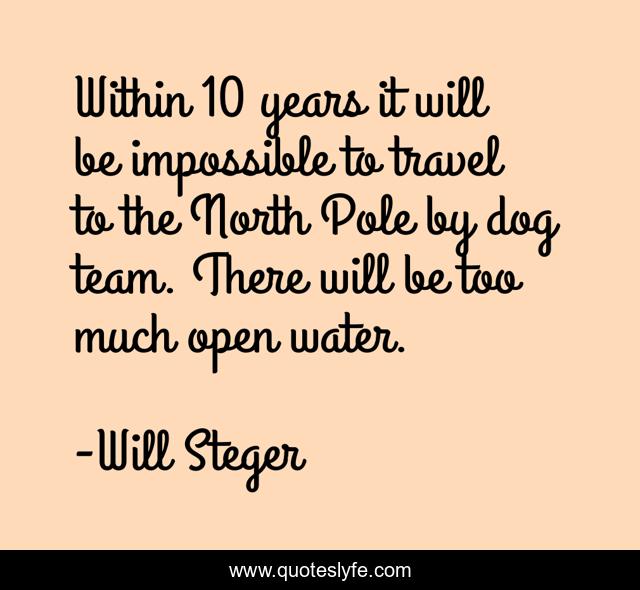 This page presents the quote "Within 10 years it will be impossible to travel to the North Pole by dog team. There will be too much open water.". Author of this quote is Will Steger. This quote is about travel, dog, team,.