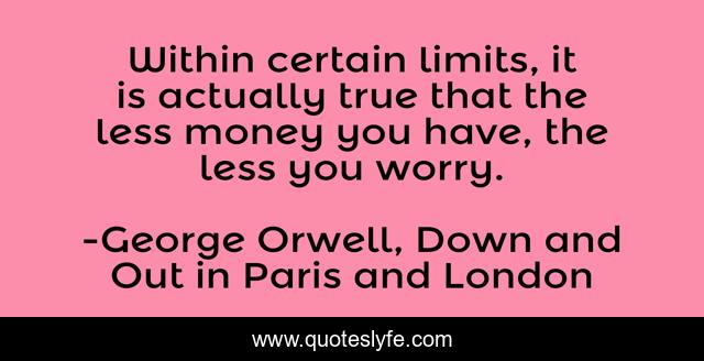 This page presents the quote "Within certain limits, it is actually true that the less money you have, the less you worry.". Author of this quote is George Orwell, Down and Out in Paris and London. This quote is about money, down-and-out-in-paris-and-london, poverty, george-orwell, worry,.