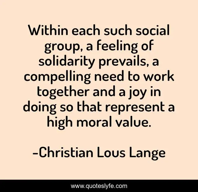 This page presents the quote "Within each such social group, a feeling of solidarity prevails, a compelling need to work together and a joy in doing so that represent a high moral value.". Author of this quote is Christian Lous Lange. This quote is about joy, together, value,.