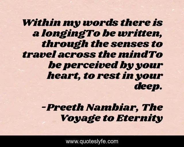 This page presents the quote "Within my words there is a longingTo be written, through the senses to travel across the mindTo be perceived by your heart, to rest in your deep.". Author of this quote is Preeth Nambiar, The Voyage to Eternity. This quote is about writers, longing-for-writing, sail-o-words,.