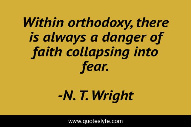 This page presents the quote "Within orthodoxy, there is always a danger of faith collapsing into fear.". Author of this quote is N. T. Wright. This quote is about fear, within, danger,.