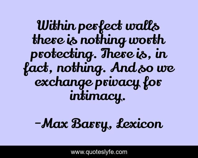This page presents the quote "Within perfect walls there is nothing worth protecting. There is, in fact, nothing. And so we exchange privacy for intimacy.". Author of this quote is Max Barry, Lexicon. This quote is about human-nature, loneliness, privacy,.
