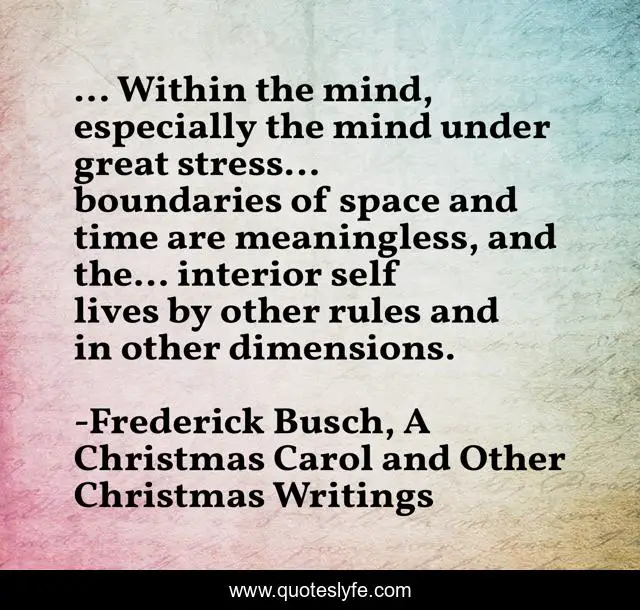 This page presents the quote "... Within the mind, especially the mind under great stress... boundaries of space and time are meaningless, and the... interior self lives by other rules and in other dimensions.". Author of this quote is Frederick Busch, A Christmas Carol and Other Christmas Writings. This quote is about stories, dreams, thoughts, fiction,.