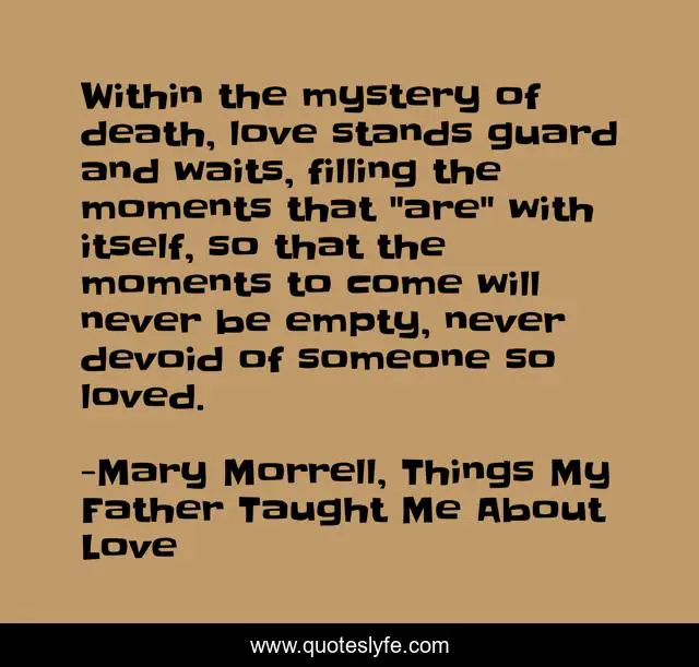 This page presents the quote "Within the mystery of death, love stands guard and waits, filling the moments that "are" with itself, so that the moments to come will never be empty, never devoid of someone so loved.". Author of this quote is Mary Morrell, Things My Father Taught Me About Love. This quote is about moments, mystery, death, love, affection,.