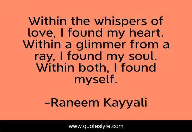 This page presents the quote "Within the whispers of love, I found my heart. Within a glimmer from a ray, I found my soul. Within both, I found myself.". Author of this quote is Raneem Kayyali. This quote is about spirituality, love, wisdom-inspirational, affection,.