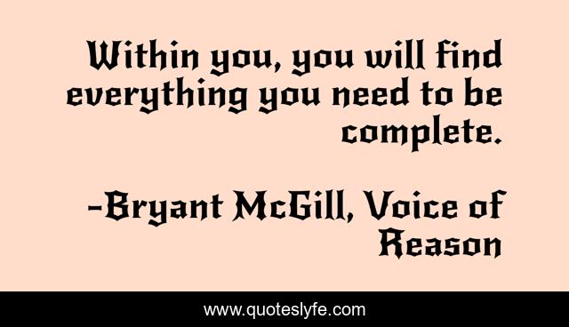 This page presents the quote "Within you, you will find everything you need to be complete.". Author of this quote is Bryant McGill, Voice of Reason. This quote is about self-discovery, self-awareness, self-actualization,.