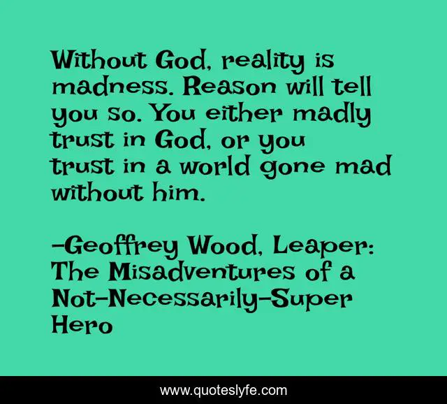 This page presents the quote "Without God, reality is madness. Reason will tell you so. You either madly trust in God, or you trust in a world gone mad without him.". Author of this quote is Geoffrey Wood, Leaper: The Misadventures of a Not-Necessarily-Super Hero. This quote is about madness, reality, god, christianity, religion, reason, christian-fiction, trust,.